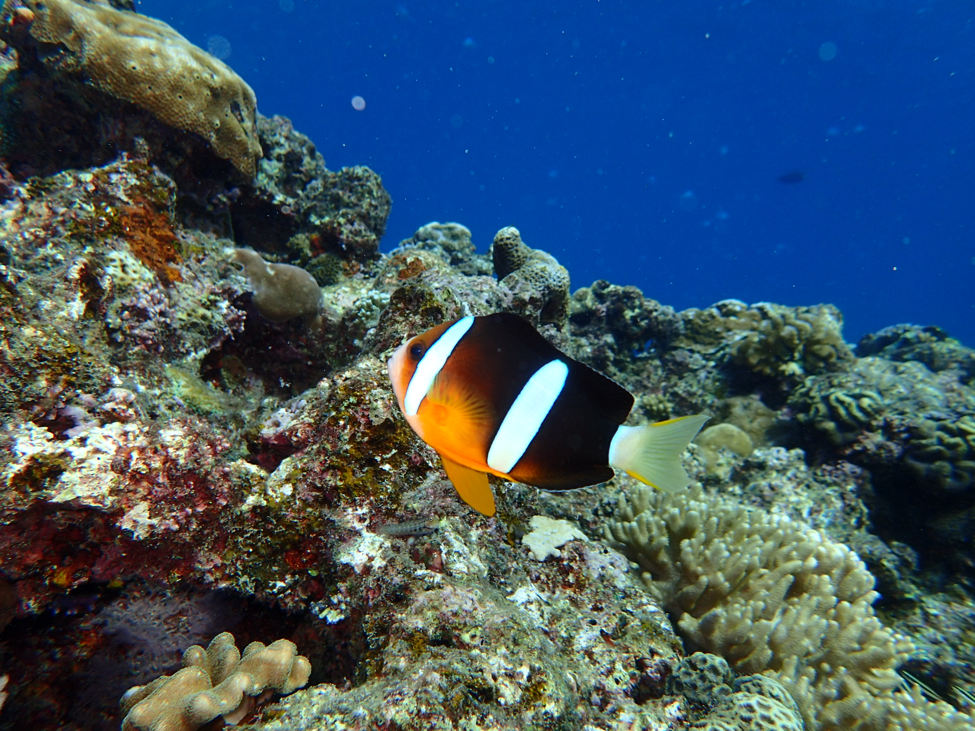 ここのビーチにはニモの親戚のクマノミちゃんが2種類生息しています!