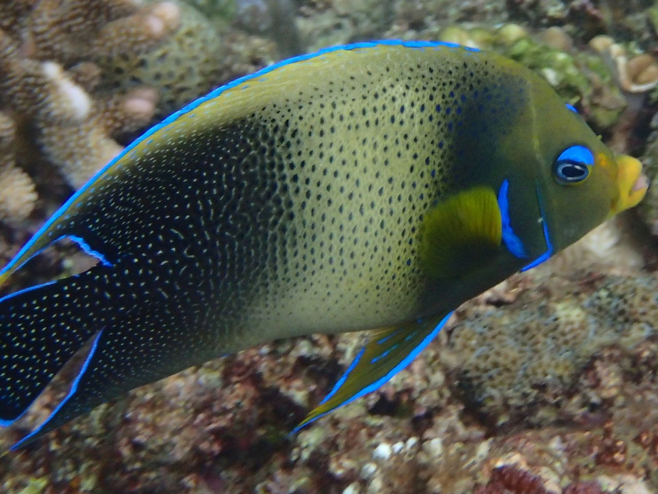 青の洞窟のポイントで見れる魚を紹介いたします!! まずトップバッターはサザナミヤッコです! 成魚はこんな感じですが、幼魚は青いキャベツみたいな模様ですごいかわいいんですよ! 写真は今度とってきます。。
